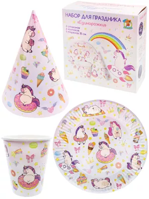 Набор бумажной посуды "Единорожки": тарелки, стаканы, колпаки 18пр.