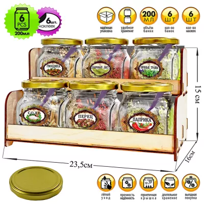 Набор банок для хранения специй 200мл с ложкой, кр.металл, на подставке, цв.золотой