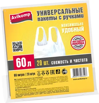 "AVIKOMP" Пакеты универсальные с ручками "Эконом" ПНД, 60л, 20шт, цв.белый