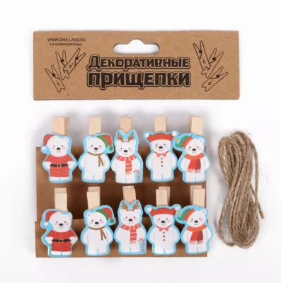 Набор прищепок декоративных "Новогодние мишки" с веревкой 10шт, 4х1,5см