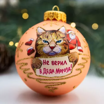 Шар новогодний "Кот.Не верил в Деда Мороза" 8см в п.у.