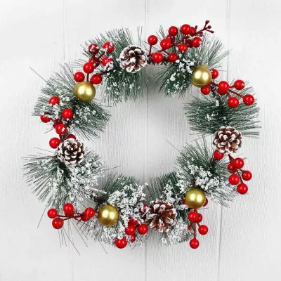 "СНОУ БУМ" Венок новогодний "Ягоды и шишки в снегу с золотыми шарами" 25см