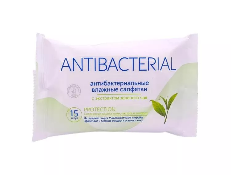 "ANTIBACTERIAL" Влажные салфетки антибактериальные "PROTECTION" с экстрактом зеленого чая 15шт.