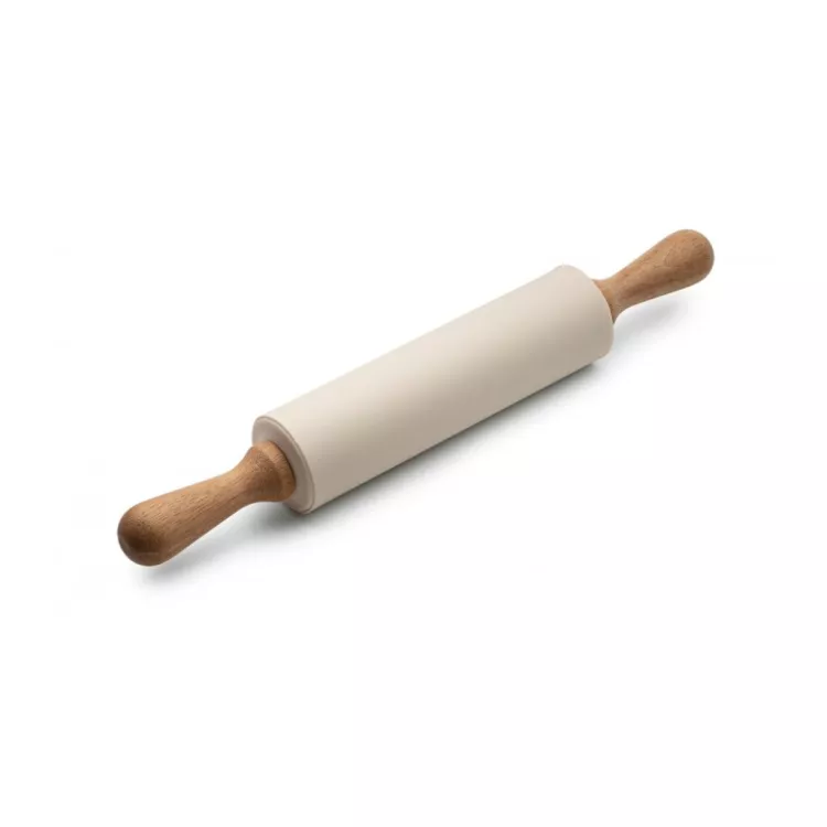 Скалка имеет гладкий вращающийся валик, покрытый силиконом и деревянные эргономичные ручки.