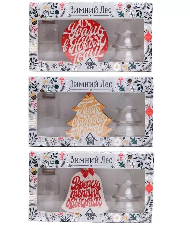 В набор входит: аромат для дома, стеклянный диффузор в форме ели, деревянное украшение для интерьера, фибровые палочки.