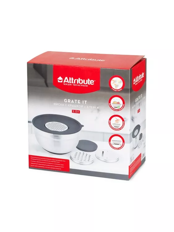 "Attribute" "Grate it" Миска стальная 3л с крышкой, 3 терки