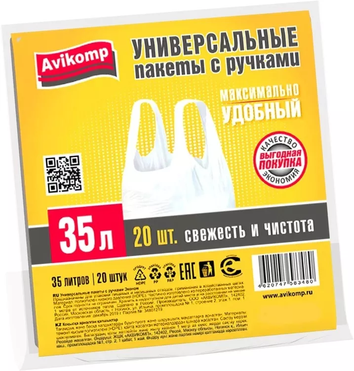"AVIKOMP" Пакеты универсальные с ручками "Эконом" ПНД, 35л, 20шт, цв.белый
