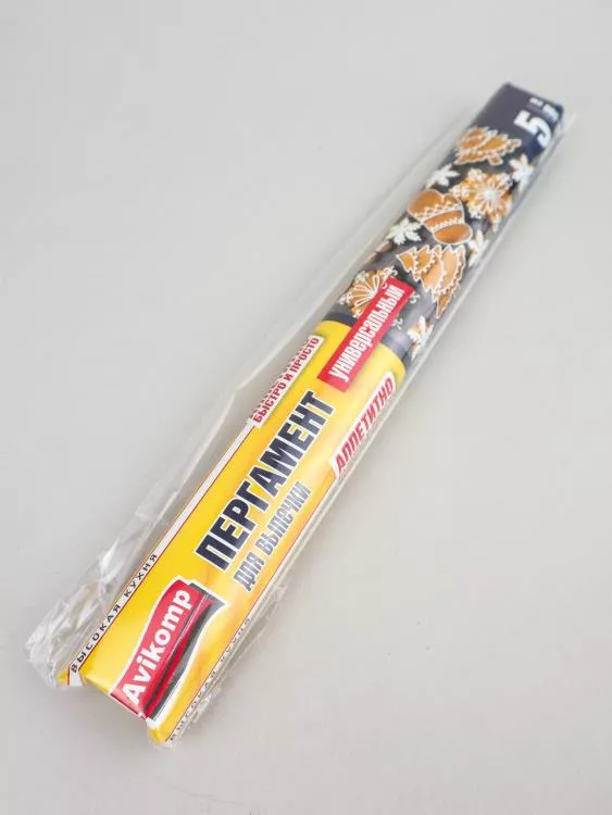 Пергамент для выпечки в рулоне длиной 5 метров. Применяется для упаковки, выпечки кондитерских изделий и запекания продуктов. Позволяет готовить продукты при температуре до 220 °C.