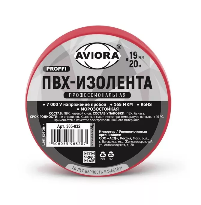 "AVIORA" Лента изоляционная 1,9смх20м, цв.красный