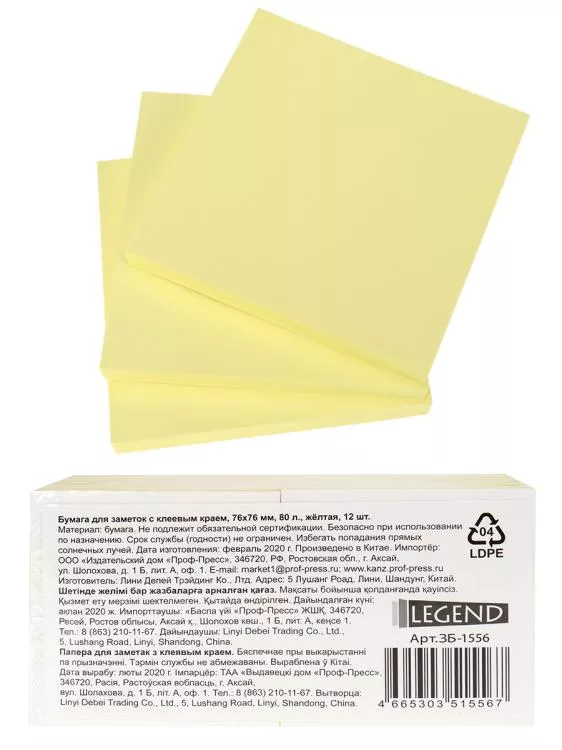 Блок с липким краем 7,6х7,6см 80л, цв.желтый