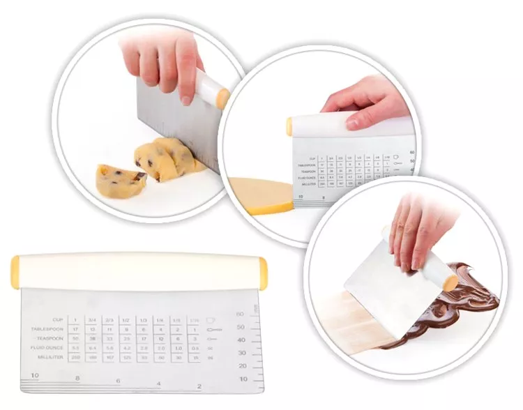 Нож оснащен таблицей для преобразования объема чашки, ложки и чайной ложки в миллилитры и унции, что облегчает процесс приготовления.