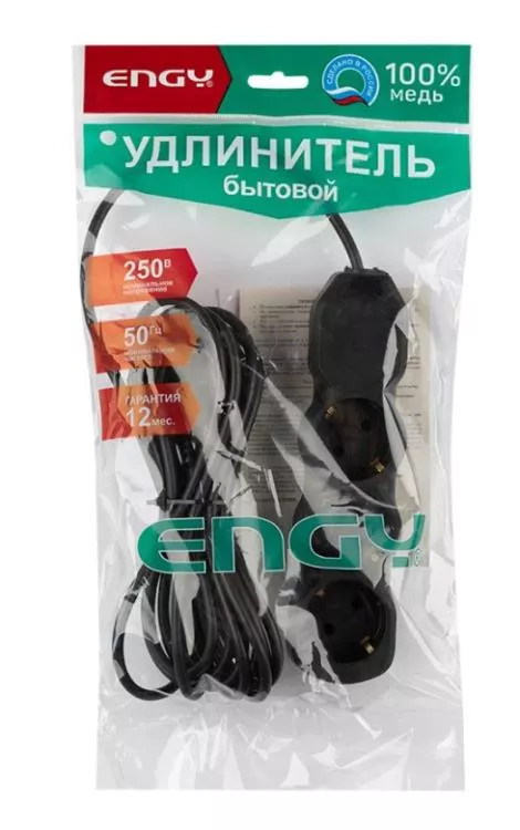 "ENGY" Удлинитель бытовой "Гранд" 3 гнезда, 5м, с/з, провод ПВС, цв.черный
