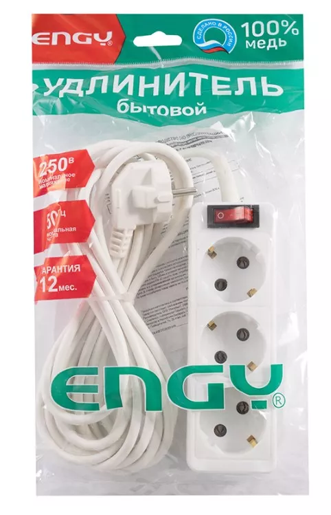 "ENGY" Удлинитель бытовой "Гранд" с выключат. 3 гнезда, 5м, с/з, провод ПВС, цв.черный