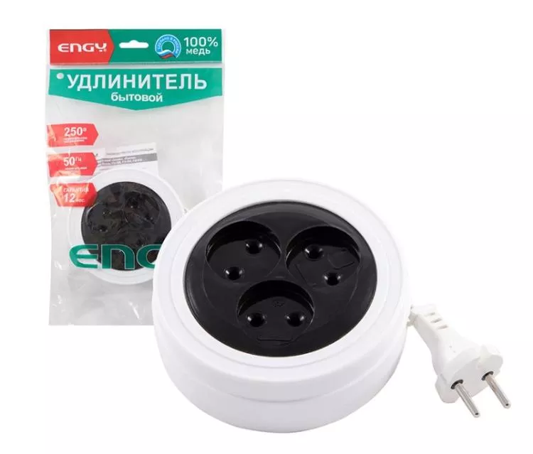 "ENGY" Удлинитель бытовой "Рулетка" 3 гнезда, 3м, б/з, провод ШВВП, цв.белый