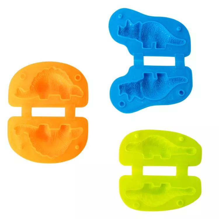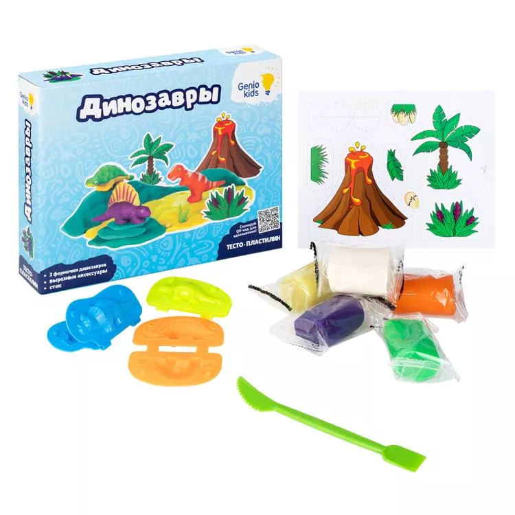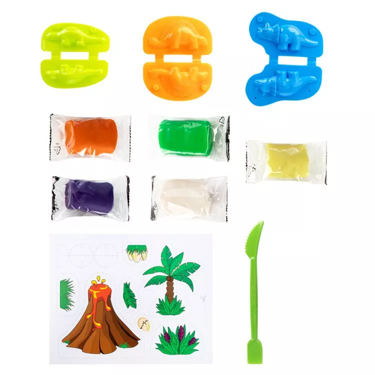 Набор для лепки динозавров из теста-пластилина. Состав: Тесто 50гр деление - 5 шт, 3 двойные формочки динозавров из пластика, стек, вкладыш.
