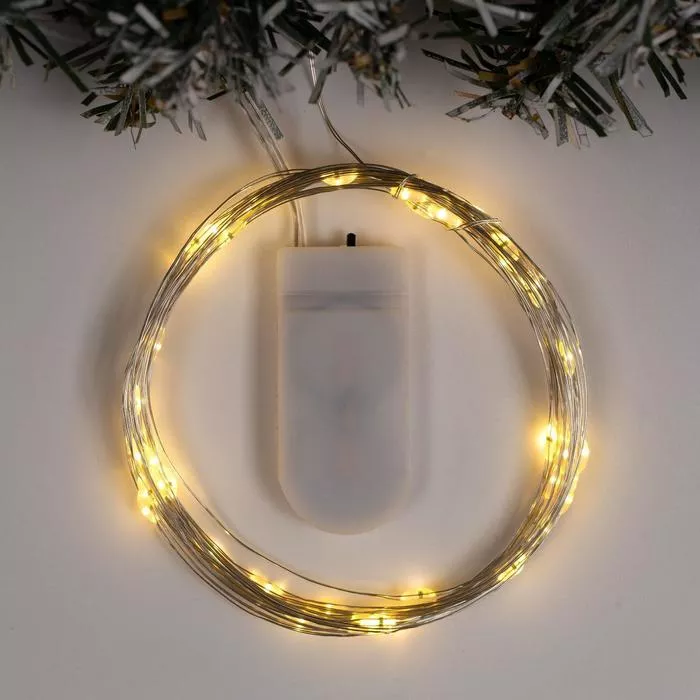 Гирлянда «Нить» 5 м роса, IP20, серебристая нить, 50 LED, свечение белое теплое, CR2032х2