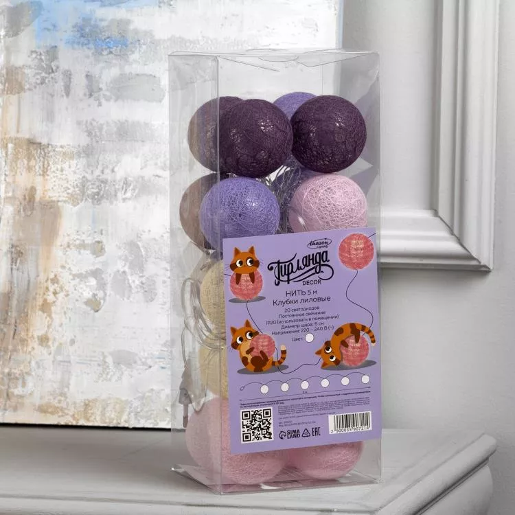 Гирлянда электрическая "Нить" 5м с насадками "Клубки лиловые", цв.белый