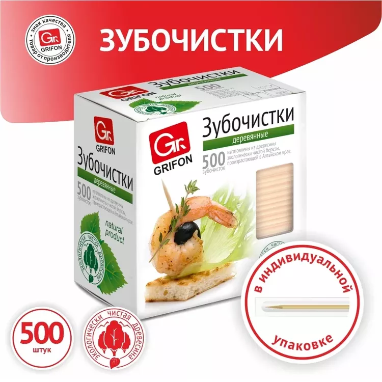 "GRIFON" Зубочистки в индивидуальной п/п упаковке, 500шт.