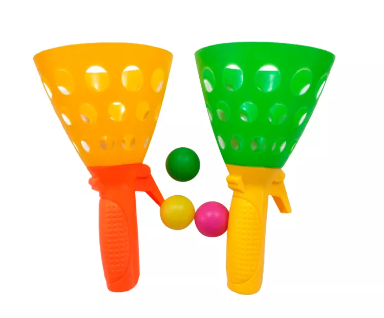 2 ракетки-запускалки конусовидной формы, 3 пластиковых шарика в сетке. 2 цвета в ассортименте: зеленый и оранжевый конус.