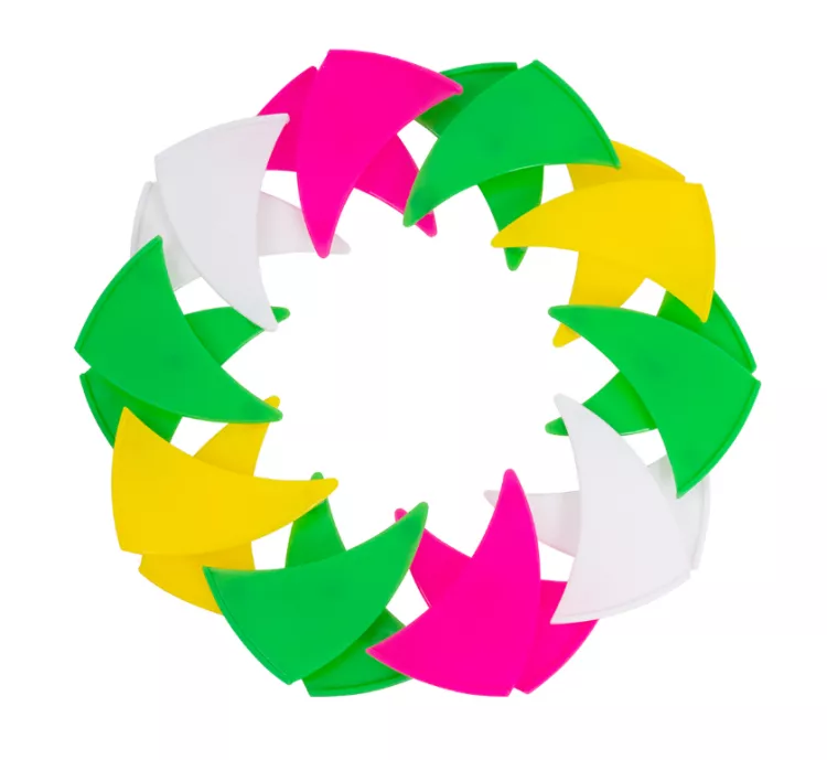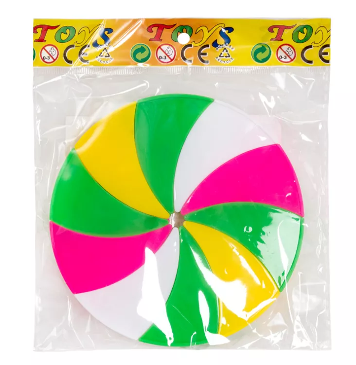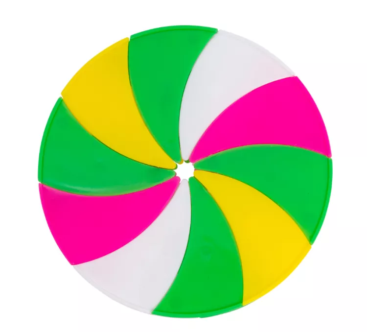 Игрушка фрисби-трансформер раскрывается в полете. В сложенном состоянии диаметр игрушки составляет 12 см. При подбрасывании игрушка трансформируется в кольцо диаметром 18,5 см, состоящее из соединенных между собой разноцветных пластин. Летающая тарелка по...