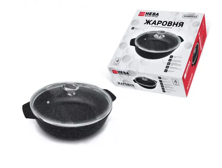 "Каменная" Чёрный гранит" Жаровня 28см, h 8,5см 4л со стекл. крышкой