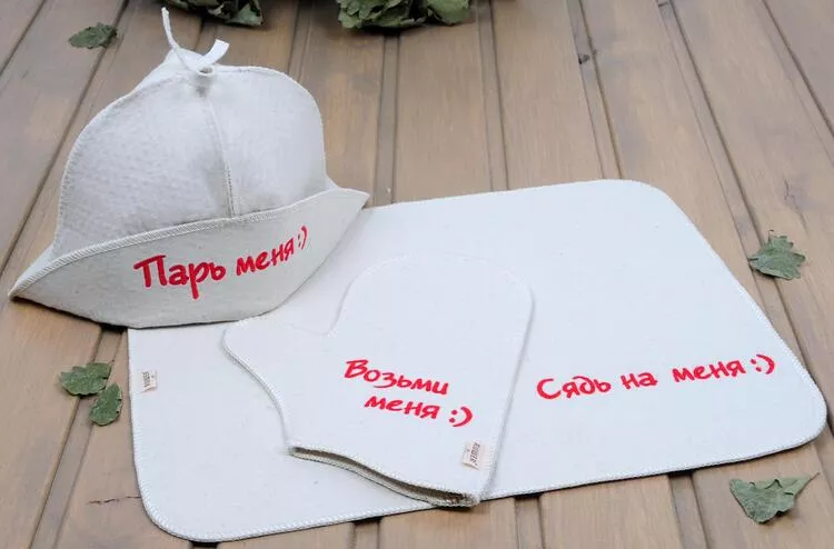 Материал: 100% шерсть. Шапка, рукавица, коврик.