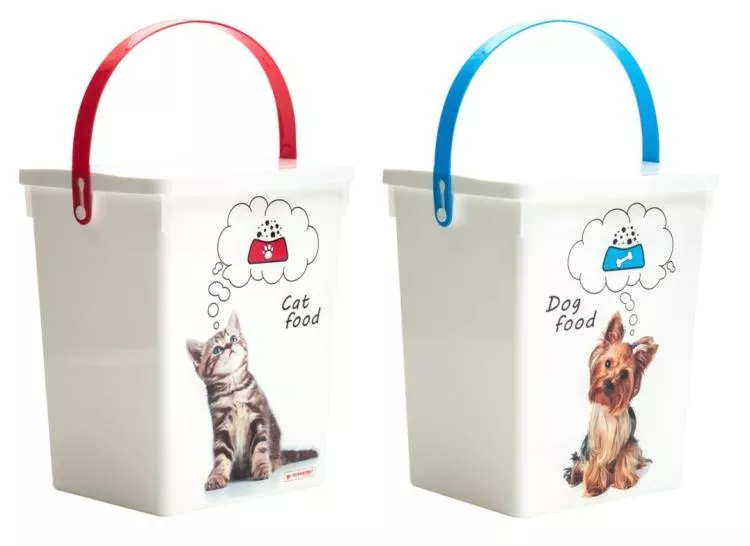 Крышка плотно закрывается, что предотвращает заветривание, отсыревание и рассыпание корма. Контейнер оснащен удобной ручкой для переноски и имеет компактные размеры.