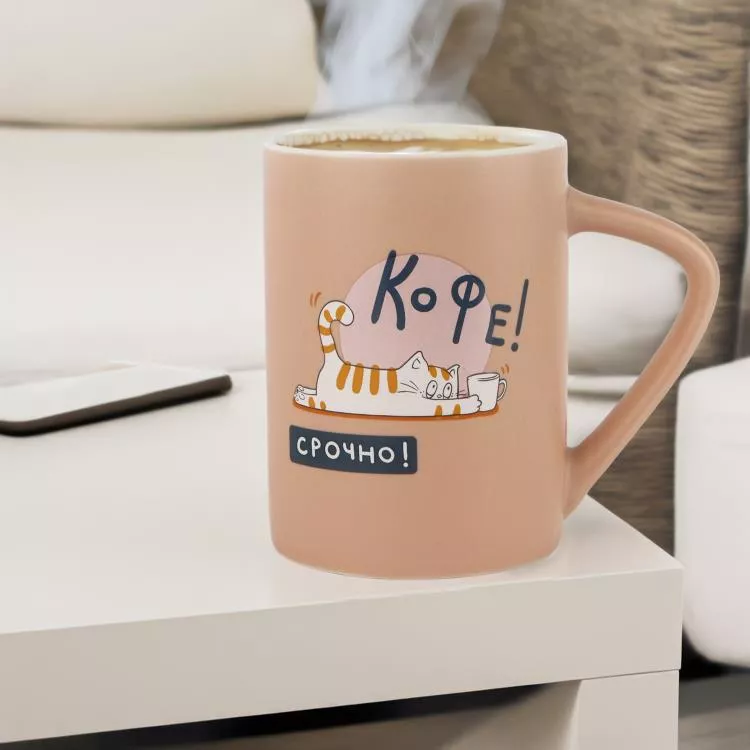 Бежевая кружка с забавным принтом кота и вдохновляющей надписью "Кофе! Срочно!" станет вашим любимым спутником на протяжении дня. Матовая поверхность придает ей особый шарм и делает приятной на ощупь. А эргономичная ручка обеспечивает комфортный хват.