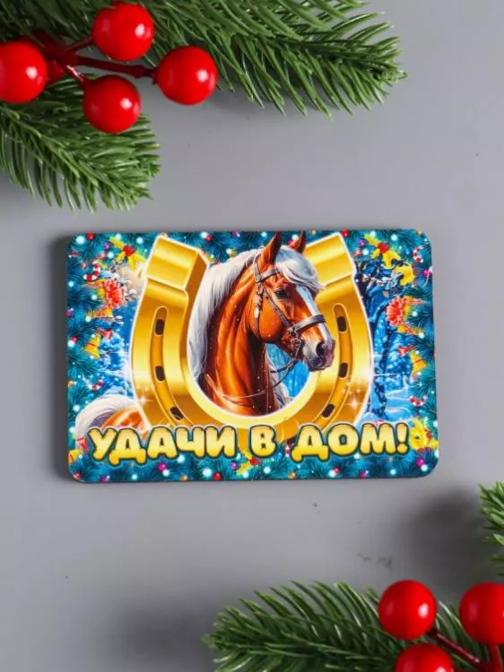 Магнит "Новогодняя лошадь. Удачи в дом" 9,5х6,5см