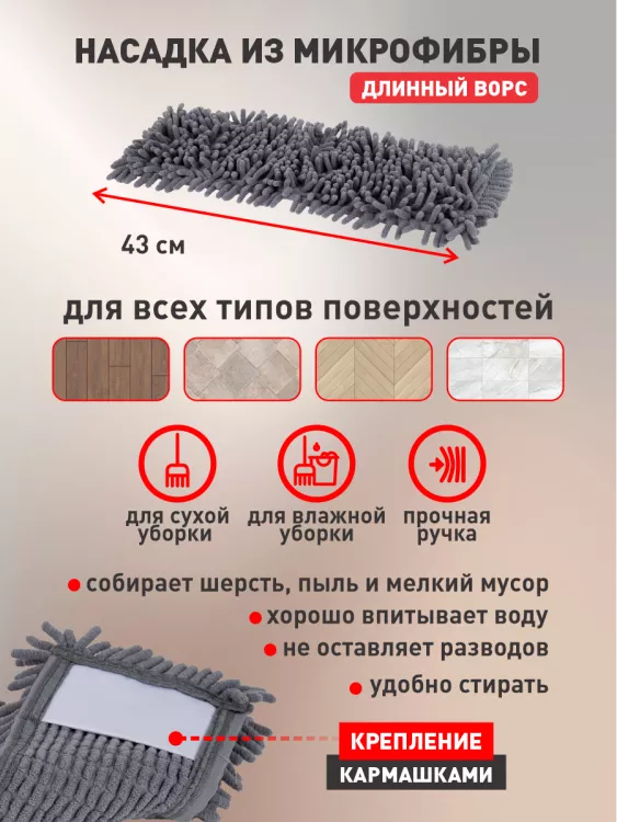 Эта насадка легко крепится к любой стандартной швабре, обеспечивая надежную фиксацию в процессе уборки. Ее размеры — 43 на 13 сантиметров — позволяют быстро и эффективно очищать как большие поверхности, так и труднодоступные места. Насадка выдерживает мно...