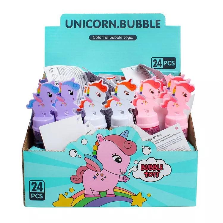 Мыльные пузыри объемом 35 мл в баночке с наконечником в виде пони. Размер баночки составляет 3,8*2,5*14 см. На палочке расположены 3 отверстия для выдува пузырей. В ассортименте 3 цвета: белый, розовый, фиолетовый. Поставка осуществляется в дисплее по 24...