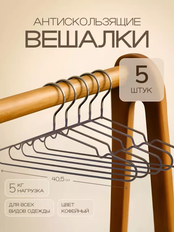 Н-р вешалок металл. с антискользящим покрытием 5шт. 40,5см, цв.кофейный
