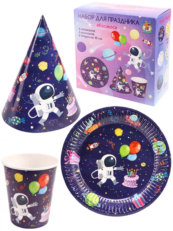 Набор бумажной посуды "Космос": тарелки, стаканы, колпаки 18пр.