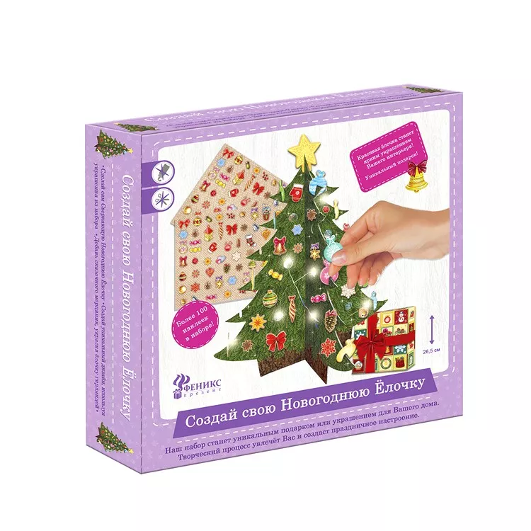 Новогодний набор для творчества Елка Новогодняя Мерцающая ёлочка (детали елки из картона; елочные игрушки из картона; бумажные наклейки; гирлянда со светодиодными лампами с питанием от батареек АА - не входят в комплект) / 22,5x20,5x20,5см арт.78568