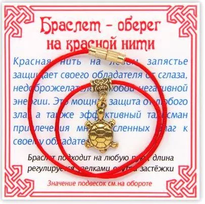 Красная нить на левом запястье защищает своего обладателя от сглаза, недоброжелателей, любой негативной энергии. Это мощная защита от любого зла, а также эффективный талисман привлечения многочисленных благ к своему обладателю.