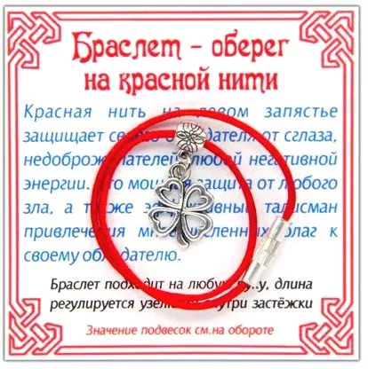 Красная нить на левом запястье защищает своего обладателя от сглаза, недоброжелателей, любой негативной энергии. Это мощная защита от любого зла, а также эффективный талисман привлечения многочисленных благ к своему обладателю.