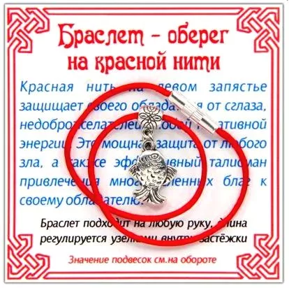 Красная нить на левом запястье защищает своего обладателя от сглаза, недоброжелателей, любой негативной энергии. Это мощная защита от любого зла, а также эффективный талисман привлечения многочисленных благ к своему обладателю.
