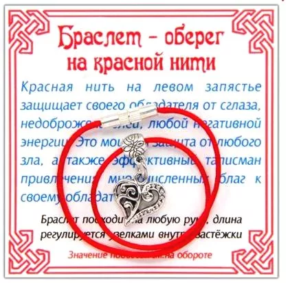 Красная нить на левом запястье защищает своего обладателя от сглаза, недоброжелателей, любой негативной энергии. Это мощная защита от любого зла, а также эффективный талисман привлечения многочисленных благ к своему обладателю.