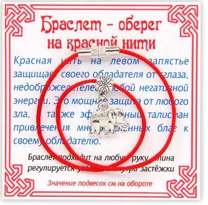 Красная нить на левом запястье защищает своего обладателя от сглаза, недоброжелателей, любой негативной энергии. Это мощная защита от любого зла, а также эффективный талисман привлечения многочисленных благ к своему обладателю.