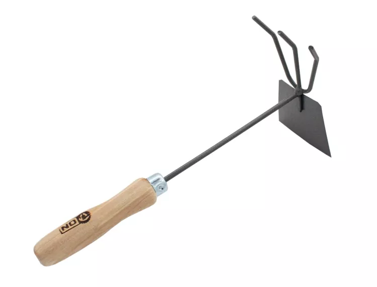 Рыхлитель ON 3 зуба + мотыжка, комбинированный, порошковая покраска, деревянная ручка 24-06-028 применяется для пропалывания грядок, рыхления грунта и выполнения небольших садовых работ. С одной стороны находится вилка для рыхления, с другой - тяпка для п...