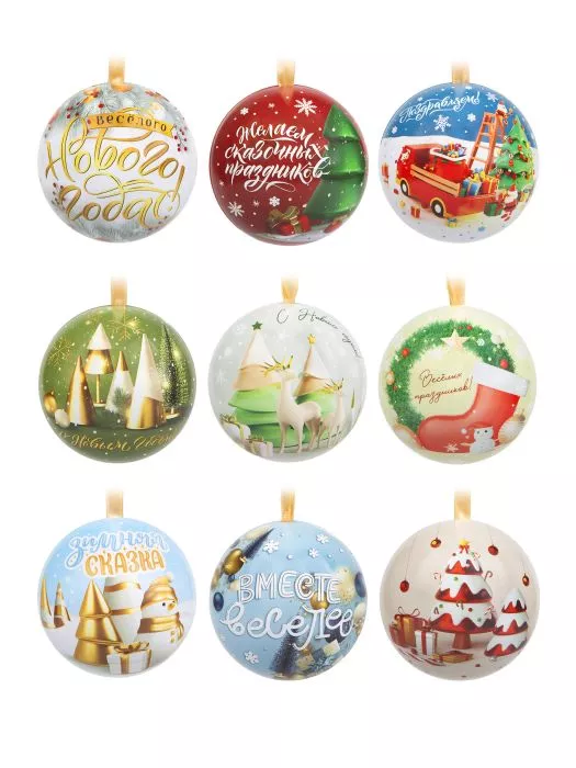 Елочное украшение шар с фантами отлично подойдет для декорации вашего дома и новогодней ели, а еще это веселое развлечение для любой компании. Шар выполнен из металла, на каждом нанесен оригинальный авторский дизайн. В наборе 9 шт...