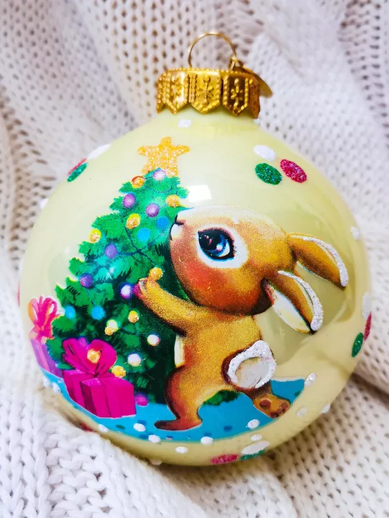 Шар новогодний "Зайчик наряжает ёлочку" 8см