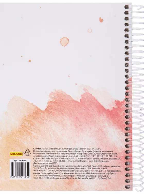 Твёрдый переплёт 7БЦ, плотность листов скетчбука 100 г/м2, 64л