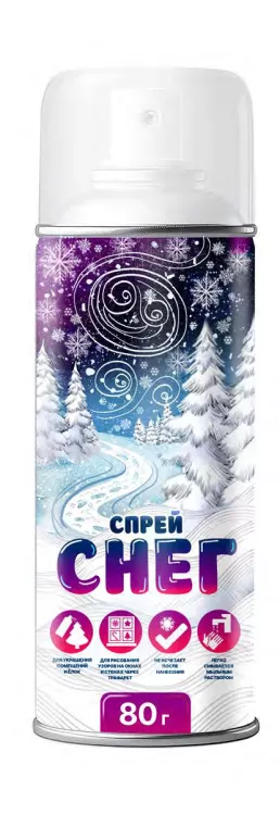 Синтетический снег нетающий, белый, в спрее для праздничного декорирования, 80 грамм (вода, этанол, стеариновая кислота, кокосовый диэтаноламид, тетрафторэтан) / 5,2х17х5,2см
