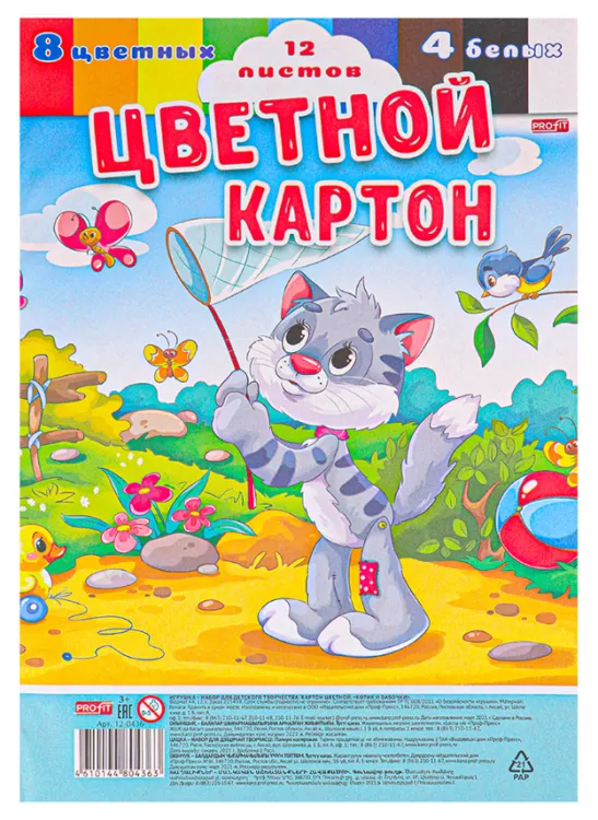 Цветной картон "Котик и бабочки" А4, 12л.