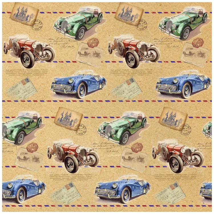 Крафт бумага Ретро-Машины для сувенирной продукции в листах размером 100*70 см, немелованная, с полноцветным декоративным рисунком, плотность 80 г/м2, свернута в рулончик