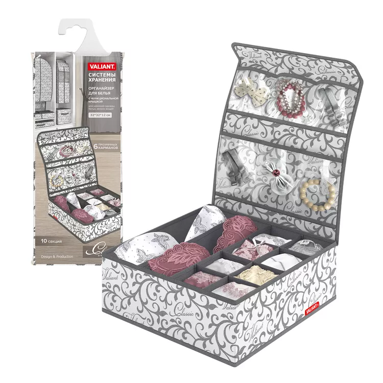 "VALIANT" CLASSIC GREY Органайзер для белья с крышкой на магните, 10секций 32х32х12см