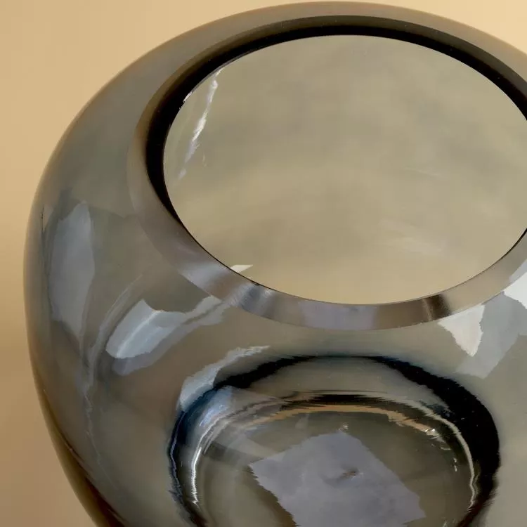 Эта стеклянная, синего оттенка ваза поражает воображение своим выразительным исполнением, напоминая шар. Оригинальная и уникальная, она предназначена для тех, кто выбирает прозрачные акценты для оформления интерьера дома или офиса.