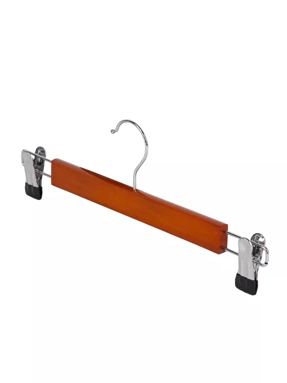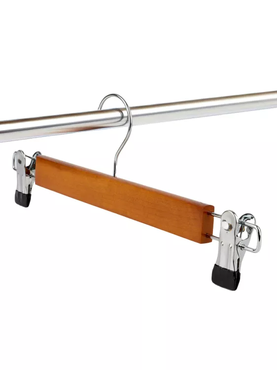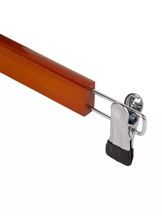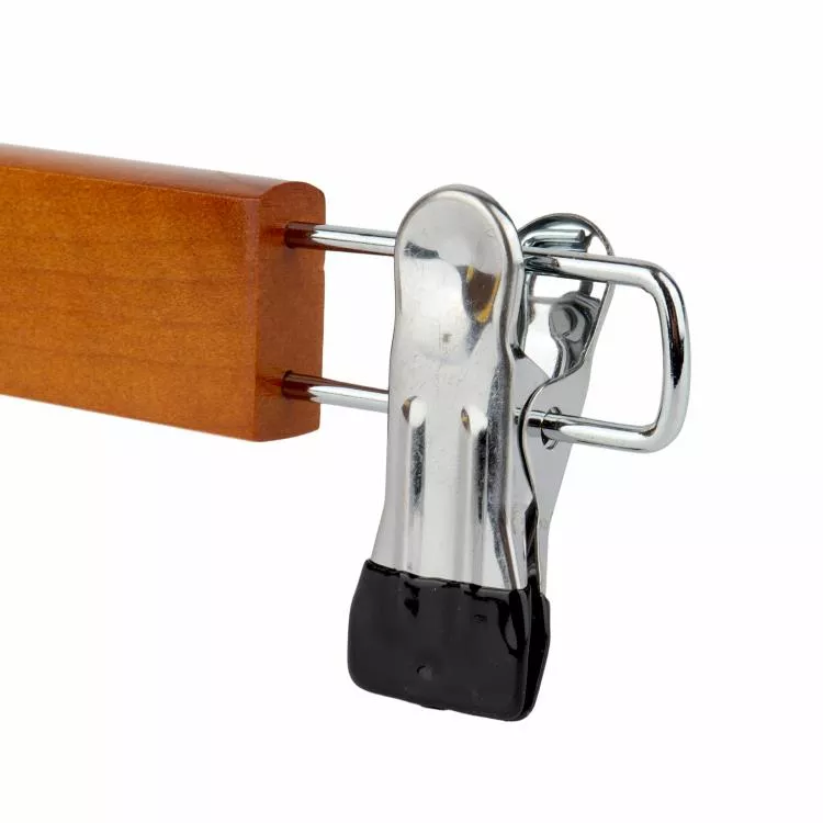 Стильная деревянная вешалка с клипсами идеально подходит для организации хранения одежды в вашем гардеробе или офисе. Прочные плечики обеспечивают надежную поддержку для брюк, юбок и других предметов одежды, предотвращая их скольжение и сминание.
