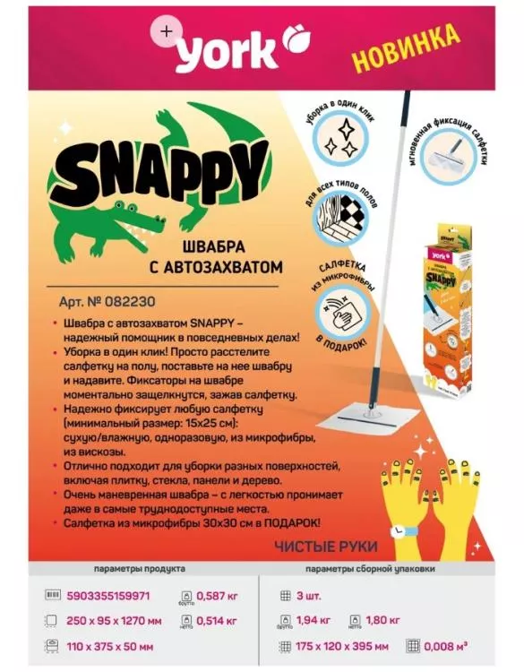"YORK"Снэппи" Швабра с автозахватом и салфеткой 30х30-127см
